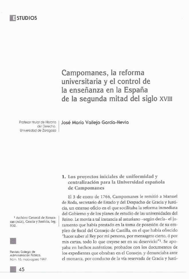 Campomanes, a reforma universitaria e o control do ensino na España da segunda metade do século XVIII