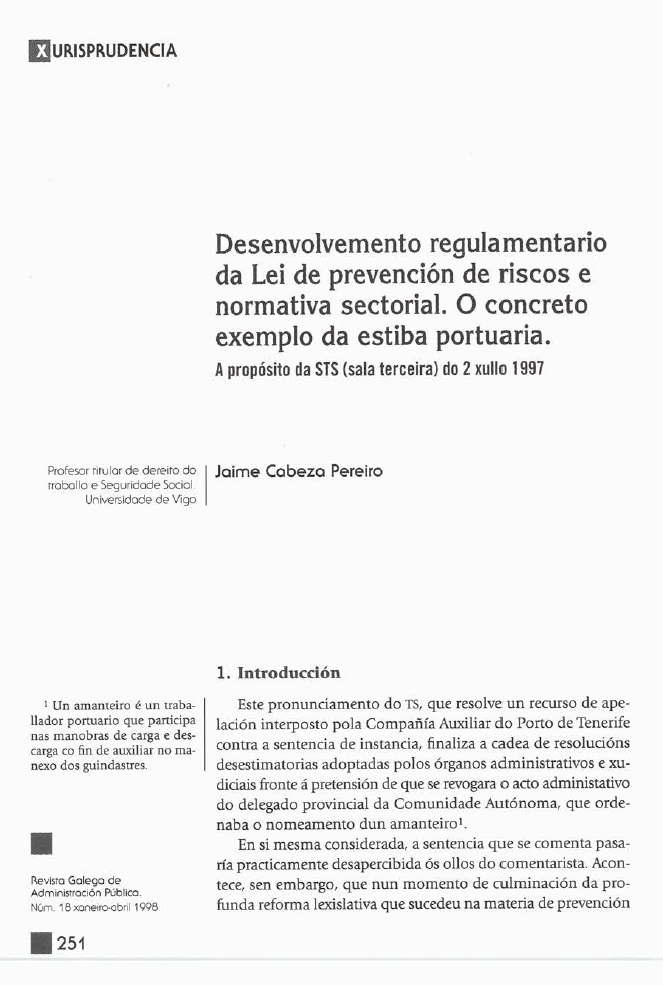 Desenvolvemento regulamentario da Lei de prevención de riscos e normativa sectorial. O concreto exemplo da estiba portuaria.