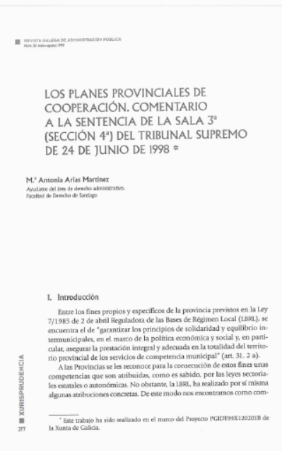 Plans provinciais de cooperación. Comentario sobre a sentenza da sala 3a (sección 4) do tribunal supremo do 24 de xuño de 1998