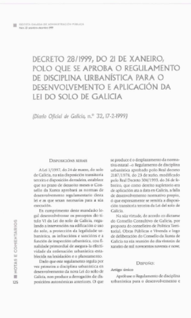 Decreto 28/1999, do 21 de xaneiro, polo que se aproba o regulamento de d1sciplina urbanística para o desenvolvemento e aplicación da lei do solo de galicia